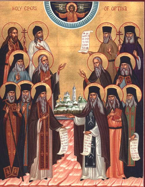 Nejednou je navštívili spisovatelé a filozofové jako Dostojevský, Gogol nebo Solovjev. Nehledali tu především zázraky, ale setkání se starci. Z něj vychází např. popis pozoruhodné postavy starce Zosimy v Dostojevského románě Bratři Karamazovi. Mezi duchovními askety a starci vynikal představený monastýru Mojsej a spolu s ním starci Makárij a Lev, velcí horlitelé pravého duchovního mnišství. Otec Makárij stál v čele skupiny literátů, kteří si předsevzali přeložit do dobového jazyka dílo starce Paisije Veličkovského. Sbírka poučení byla nazvána Filokálie, též Dobrotoljubije, tj. láska k dobru.